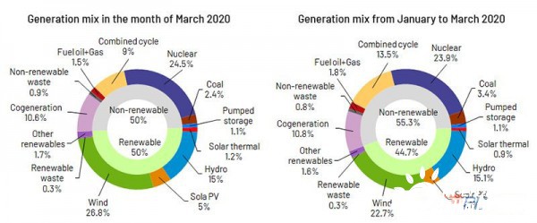 據(jù)最新消息,2020年3月份,西班牙可再生能源發(fā)電量占總發(fā)電量50%左右,其中光熱發(fā)電占比為1.2%,風(fēng)力發(fā)電占26.8%,太陽能光伏發(fā)電占比為5%。同時(shí),3月份高達(dá)75.6%的發(fā)電量均來自不排放二氧化碳的發(fā)電技術(shù),而1—3月份可再生能源累計(jì)發(fā)電量占發(fā)電總量的44.7%。