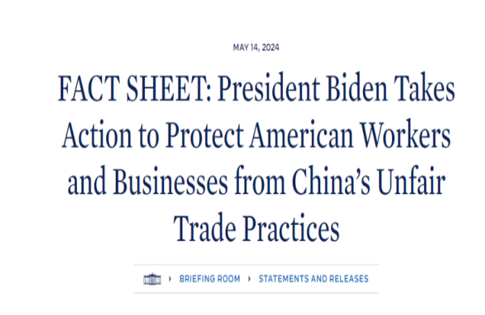 本周二(5月14日),白宮正式對(duì)中國(guó)太陽(yáng)能電池、電動(dòng)汽車、計(jì)算機(jī)芯片和醫(yī)療產(chǎn)品等一系列商品進(jìn)行大幅加征關(guān)稅。